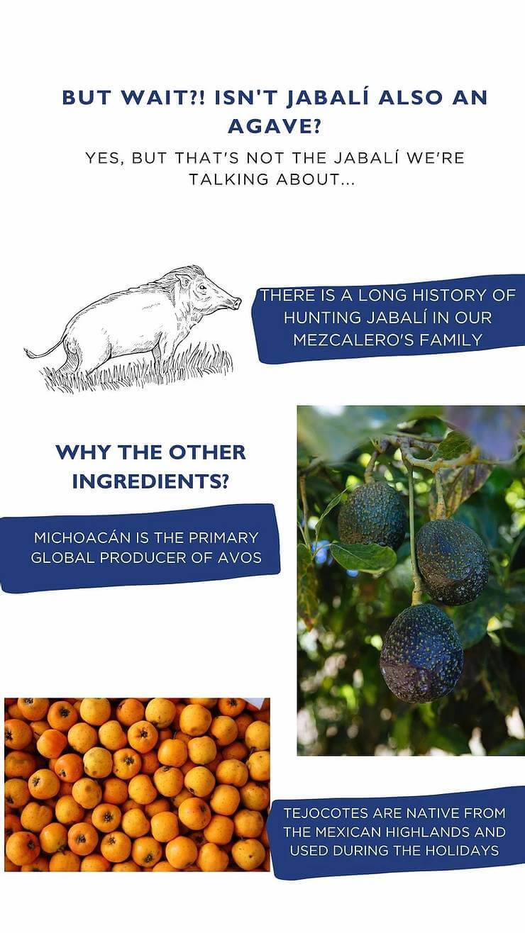 Jabalí means wild boar in Spanish, and there is a long history of hunting in our mezcalero’s family. We also brought in the flavors of Michoacán with avocados— the majority of the world’s supply is grown right here in Michoacán. Seasonal fruit tejocote and epazote (aromatic herbs) were added as well.